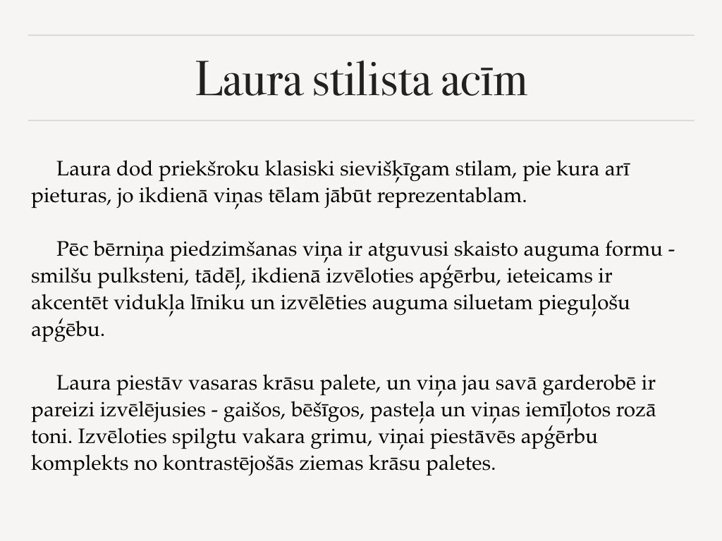 Mans darbs ir radīt skaistumu sev apkārt. Tas neaprobežojas tikai ar profesionālo darbību kā frizierim vai vizāžistam, tas raksturo kā es izdzīvoju dzīvi ar skaistumu un harmoniju tajā. Mīlu stilu "viss tā vienkārši gadījās". Šis stils veidojas no mazām detaļām, kas apvienojas vienotā harmoniskā veselumā, manā rokrakstā. Savā meistarībā turpinu pieaugt, izaicinot sevi jauniem projektiem un atkal un atkal apgūstot jaunas prasmes un iemaņas.