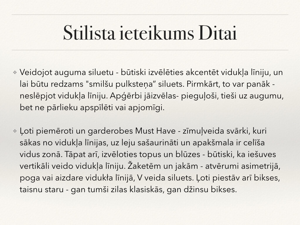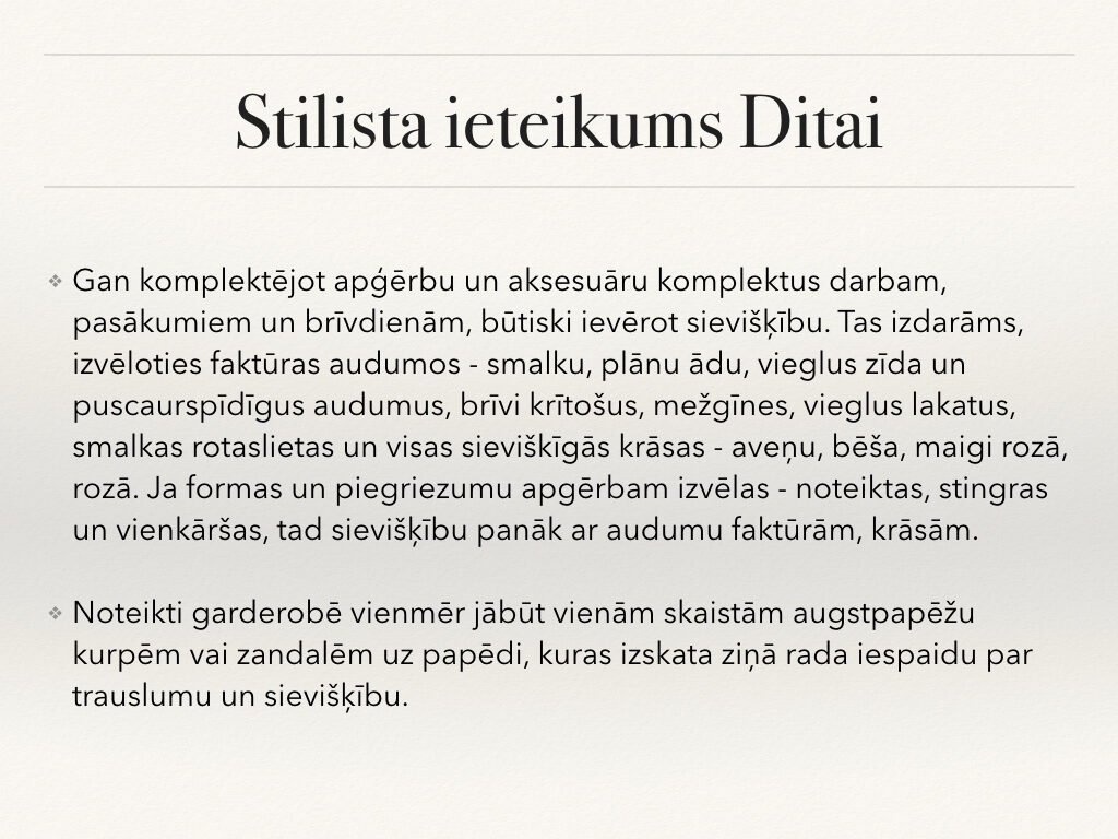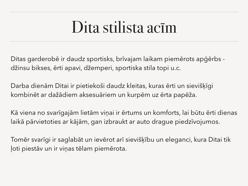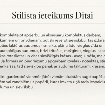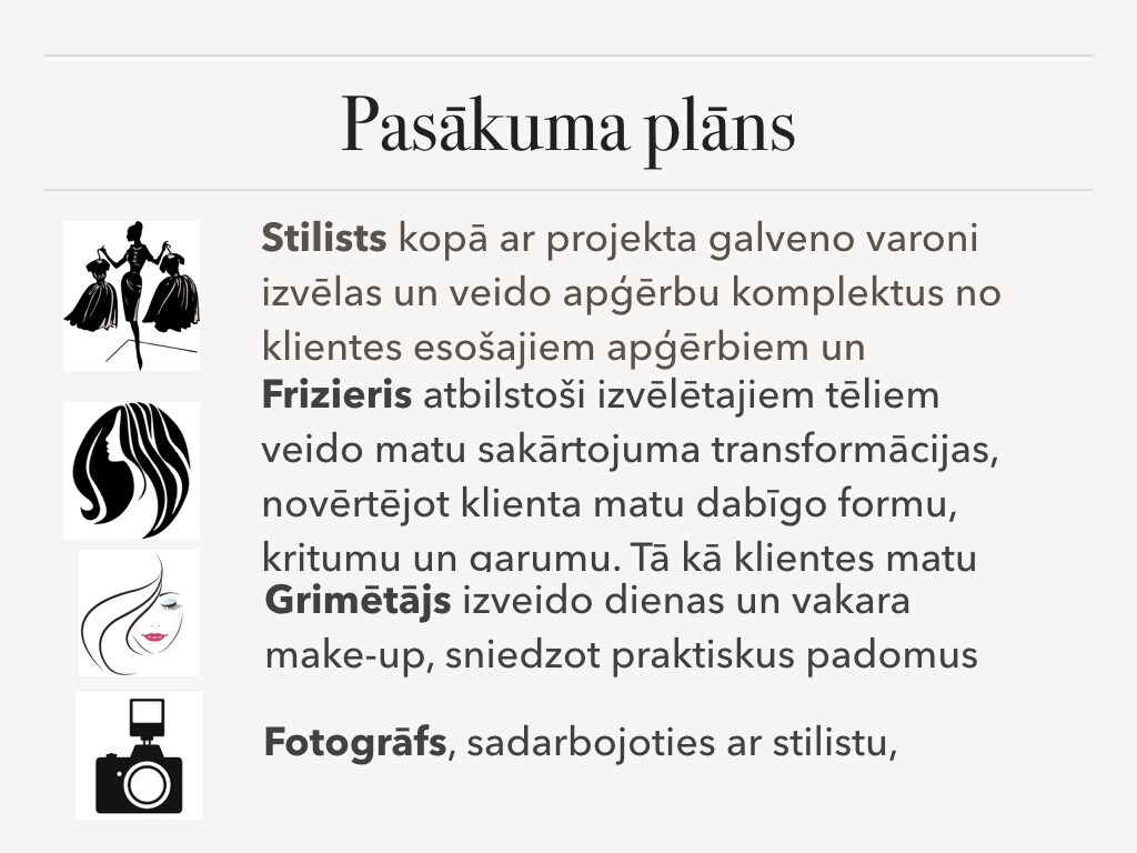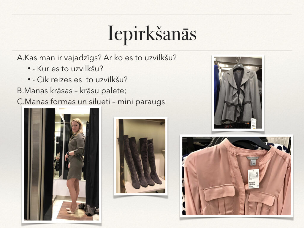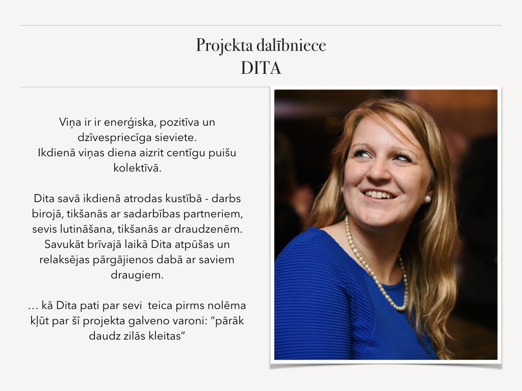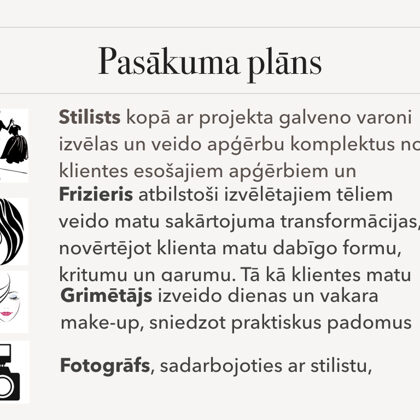 Stila grāmata ir tikai gala rezultāts pēc liela darba: stila konsultācijas, skapja šķirošanas, iepirkšanās, frizūru veidošanas un makup apmācības. Tas bija tik aizraujošs process, iemācījos tik daudz interesantas un noderīgas lietas no Lauras un Evijas. Viņām ir daudz noslēpumu kā pavisam vienkārši var iegūt fantastiskus rezultātus. Projekta noslēguma diena ir visa sākums, pēc fotosesijas un foto grāmatas saņemšanas sākas īstais darbs, kad jaunie knifiņi ir jāievieš ikdienā; jāizmēģina jauna frizūra, jāizmēģina jauns makup vai jāpapildina sava garderobe.