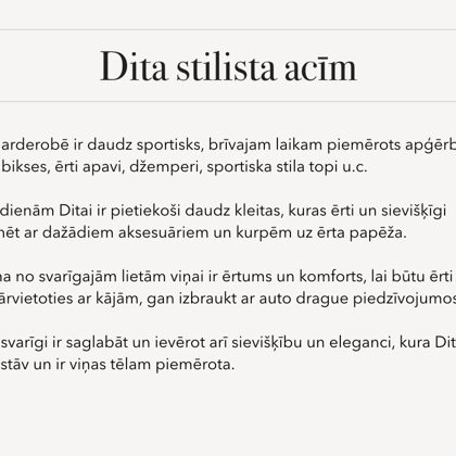 "Mēs ar Lauru iepazināmies BNI brokastīs, kur viņa no rīta apsēdās man blakus. Lauras prezentācija mani uzrunāja, taču tajā rītā neizdevās daudz parunāt, par laimi Laura ieradās uz BNI miljonāru ballīti. Mēs sākām runāt par „Košuma Darbnīcu” un es atceros, ka teicu Laurai: „Esmu izgājusi visus tos stila kursus, bet jēgas nekādas; kā nav ko vilkt mugurā, tā nav! Man vajadzētu kādu, kas izrevidē manu skapi un palīdz tajā atrast man piemērotas lietas.” Laura teica, ka viņai esot tieši tas, kas man vajadzīgs, jo pavisam drīz būs jauns projekts, tiks izrevidēts klientu skapis un tas, kas klientiem jau ir pieejams. Tā arī viss sākās, turpat uz vietas pasākumā Laura mani izveidoja interesantu frizūru, lai es varētu piedalīties pasākuma foto konkursā, kurā gala rezultātā es uzvarēju. Paldies, Laura!